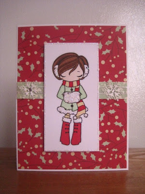 My main image is from the Greeting Farm Rain, Snow, Shine set and I colored her with Copics. As you can see in the inspiration photo, the holly leaves are dusted with glitter, so I knew I needed to have some glitter on my project as well! I used Stardust Stickles on all the trim on her outfit, as well as on her earmuffs. I also used the Stickles to create a border ar