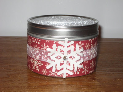Other: May Arts ribbon, Making Memories snowflake blossoms, Zva Creative clear crystal dot, 4 oz. round clear top tin