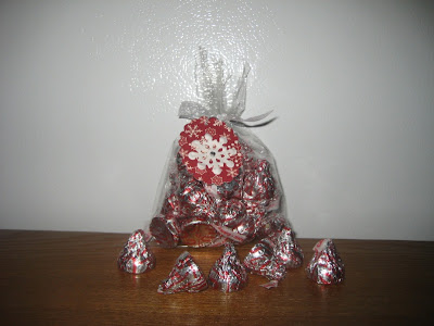 First off is the bag of Kisses. I just put those in a clear cellophane bag and tied it off with some white polka dot ribbon from May Arts. It looks like she's just run out of the white ribbon, but check out the ribbon selection in the store for a variety of other colors. I then made a little tag for the bag using some paper from the Imaginisce Polar Expressions collection and a Making Memories snowflake blossom with a Zva Creative clear crystal dot in the middle.