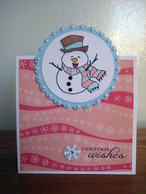 The snowman is punched out with a Marvy mega circle punch and matted on a Marvy giga scalloped circle. On each scallop I adhered a Zva Creative white pearl using a Quickie glue pen. The circle is then adhered to the base using more Zva Creative 1mm adhesive dots.