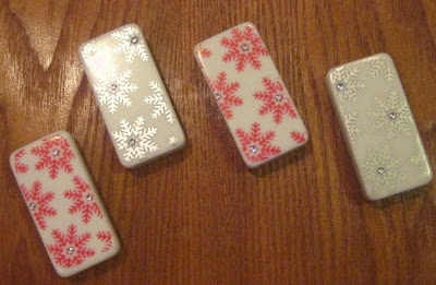 Next up I embellished one of the 4 oz. round clear top tins, again using the same paper, ribbon, and snowflakes. I just love making a set of things that match - it appeals to the OCD side of me I think! I was trying to figure out what to put inside the tin and decide to make some magnets using dominoes. I used the snowflake stamp from Keep Cozy by The Greeting Farm and stamped two dominoes with red ink and two with silver. I then adhered small clear gemstones from the Zva Creative crystal wheel to the center of each of the snowflakes. To turn the dominoes into magnets, I cut up some self-stick business card magnets and stuck them right on the backs of the dominoes. Sorry for the less than stellar picture of the dominoes - I was taking these photos at night and could not for the life of me get a photo that wasn't too full of flash or too dark!